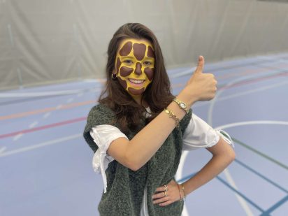 Mascotte Prutskes Court- Nieuwsgierige giraf met een groot hart op de juiste plaats.